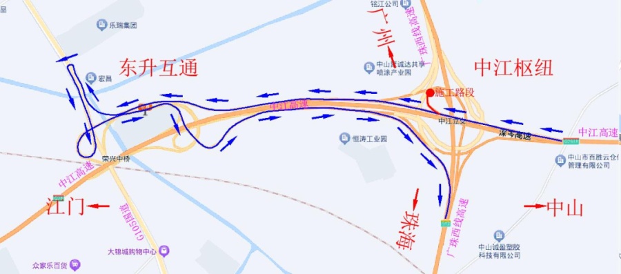绕行路线:广珠西线高速→中山西收费站→坦背西二马路→小榄工业大道→小榄收费站→中江高速。