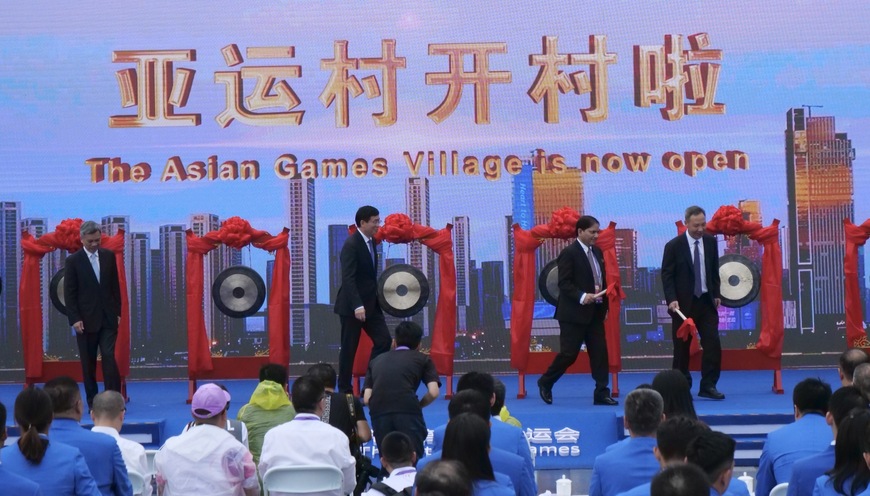 国家体育总局副局长、中国奥委会副主席、中国体育代表团副团长周进强,亚奥理事会代理总干事维诺德,浙江省委常委、杭州市委书记、杭州亚组委副主席刘捷,浙江省副省长李岩益,杭州市市长、杭州亚组委副主席兼秘书长姚高员,杭州市人大常委会主任、亚运村村长李火林一起上台鸣锣开村。