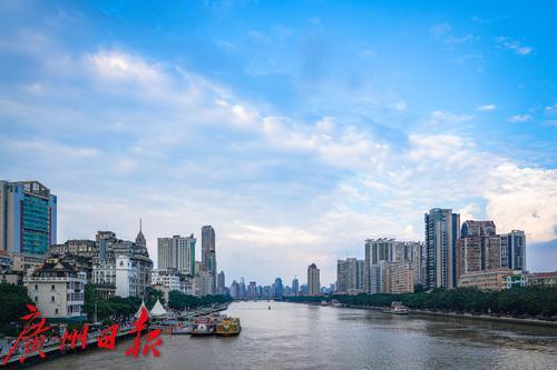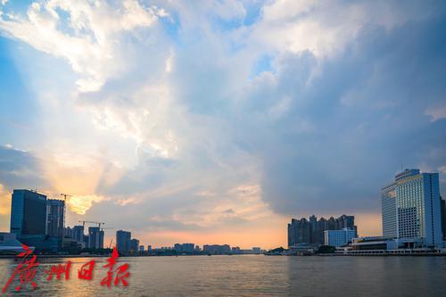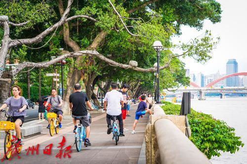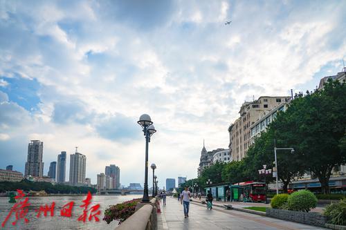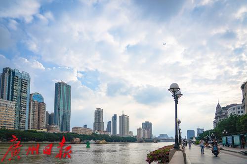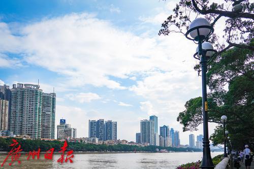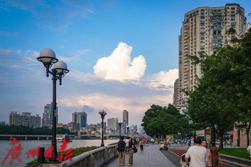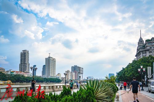 9月16日,广州今日天气舒适,大部分时间都是晴天。连日的雨水天气终于消散,白云高挂蓝天。傍晚时分,西边的天空还出现了久违的夕阳。恰逢周末,市民游客纷纷趁着好天气出门走走,珠江边长堤一带,不少人骑行、跑步、拍照,享受这雨后的晴天。