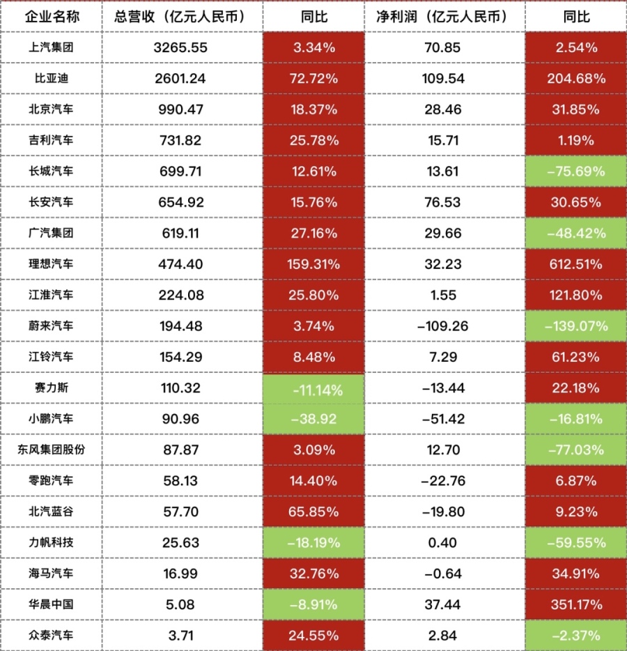 9月首周,国内多家上市车企已经全部披露2023年上半年财报。全媒体记者梳理发现,20家20家A/H股上市车企中,16家实现营业收入同比增长,13家实现净利润同比增长,1家扭亏为盈。其中比亚迪、长安汽车增速明显,比亚迪成为上半年最赚钱车企,净利润达109.54亿元;长城汽车和东风集团的同比跌幅超七成;小鹏汽车和力帆科技出现营收利润双降,特别是小鹏汽车,其净亏损超50亿元人民币。