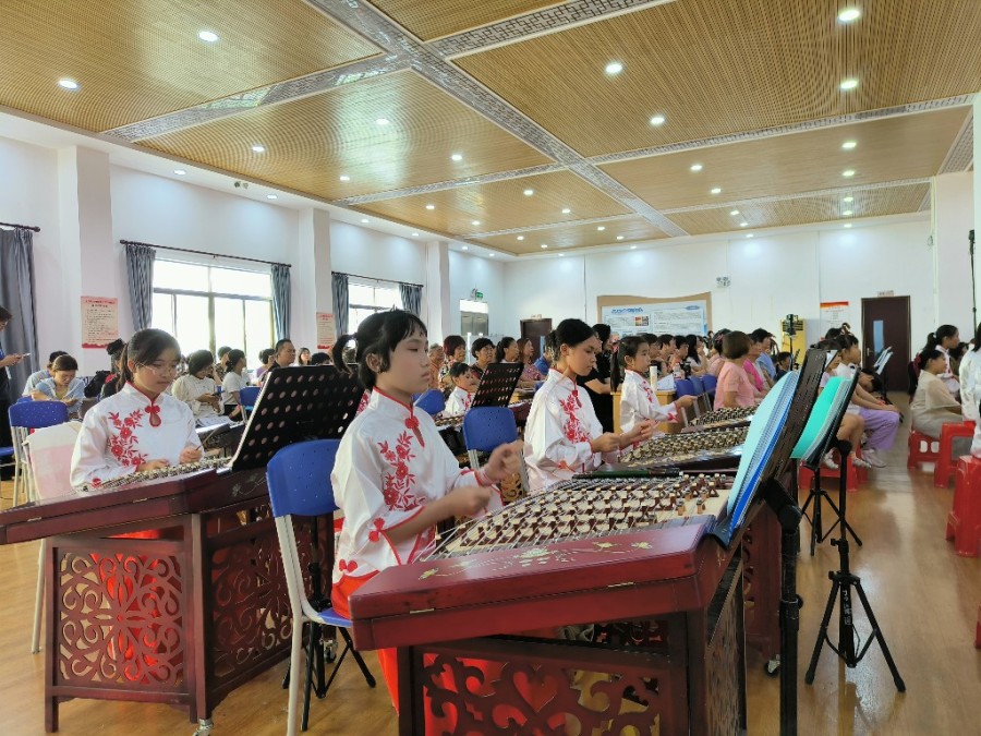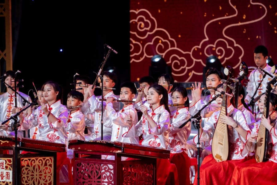 高胡、扬琴、二胡、秦琴、笛子……青少年朋友齐聚舞台中央,熟练地演奏起各种乐器,音调昂扬的旋律,热情奔放的节奏,朝气蓬勃、积极阳光,让整个演出会场充满欢乐、喜庆的气息,拉开了整场晚会的序幕。