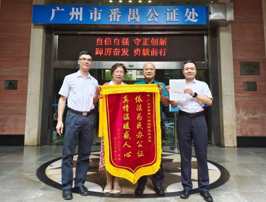 “太感谢番禺公证处,打破佳木斯和广州3690公里的距离,帮我解决了遗产继承的棘手问题!”近日,在番禺公证处业务大厅当事人李阿姨送出锦旗和感谢信,并讲述了公证员张海龙和助理陈伟东这四个月以来为她解决继承难题的经过。