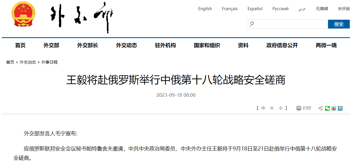 应俄罗斯联邦安全会议秘书帕特鲁舍夫邀请,中共中央政治局委员、中央外办主任王毅将于9月18日至21日赴俄举行中俄第十八轮战略安全磋商。