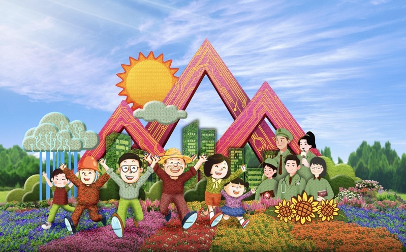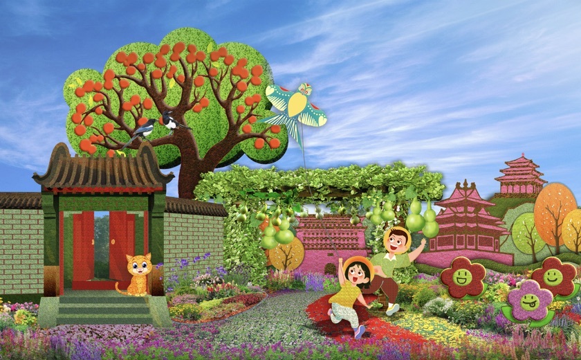 3.东单东南角的“共同富裕”主题花坛顶高达9.5米,以欣欣向荣的城乡融合发展为场景,描绘了中国式现代化全体人民共同富裕的美好蓝图。