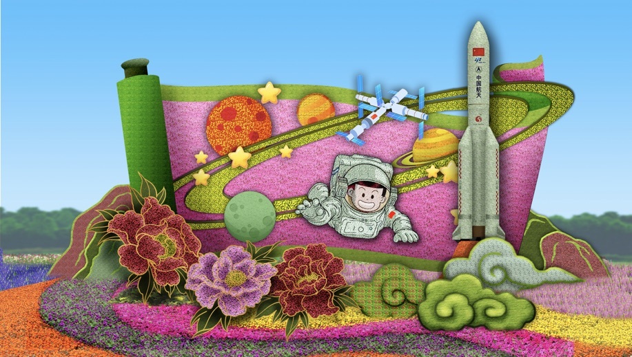 10.复兴门东北角的“筑梦未来”花坛顶高8.5米,以中国航天员、空间站为主景,寓意航天强国建设蓬勃发展,助力中国梦早日实现,全面推进中华民族伟大复兴,谱写新时代中国特色社会主义更加绚丽的华章。