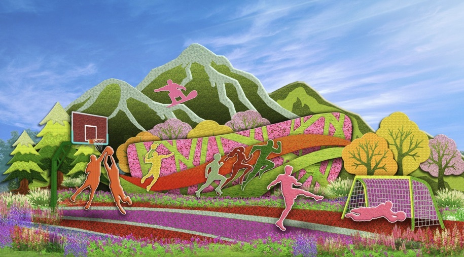 6.西单东北角的“全民健身”花坛顶高8.5米,以丰富多彩的全民健身为题材,配以篮球、羽毛球、跑步、滑雪等运动场景,寓意全民健身共享美好生活。