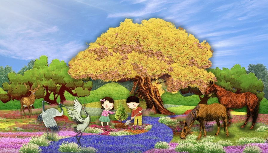 4.东单西北角的“和谐共生”花坛顶高8.5米,“三北工程”绿色长城为主景,配以野马(西北)、麋鹿(华北)、白鹤(东北)、胡杨等典型物种,体现了生态治理的典范,寓意坚定不移走好人与自然和谐共生的中国式现代化之路。