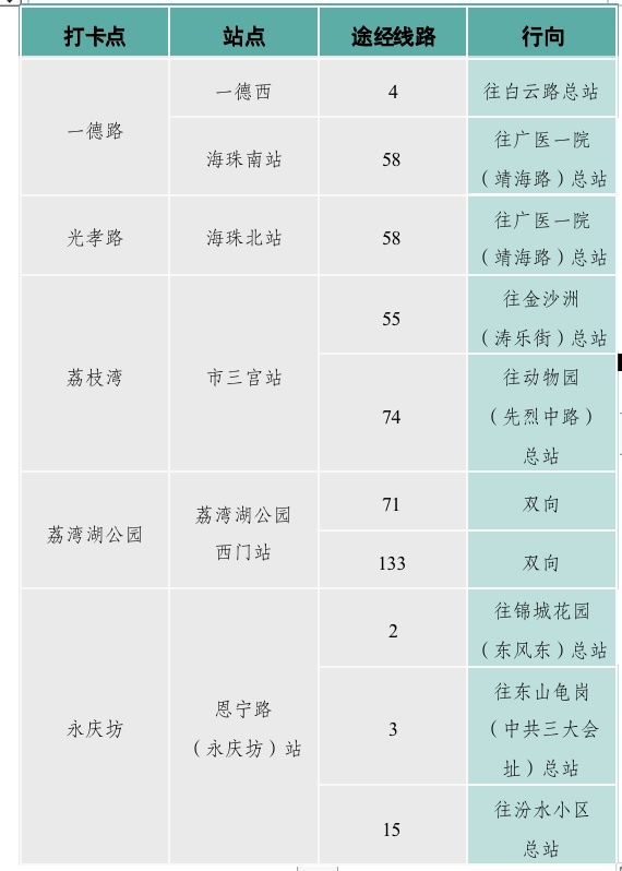 据悉,广州市一汽巴士有限公司一分公司有2、3、4、15、55、58、71、74、133等线路途经上述热门打卡点,市民可以搭乘这些公交线路,在一德西站、海珠南站、海珠北站、市三宫站、荔湾湖公园西门站、恩宁路(永庆坊)站等站点下车,穿街走巷过中秋。