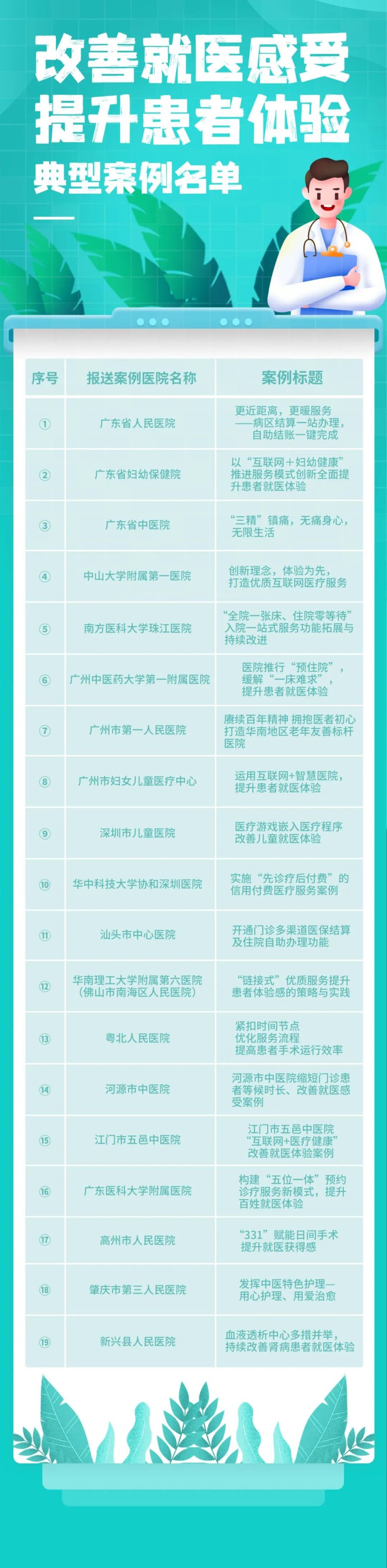 近日,广东省卫生健康委发布改善就医感受提升患者体验典型案例,省人民医院、省中医院、广州市第一人民医院等单位报送的19个案例入选。
