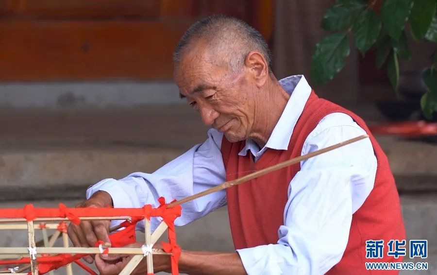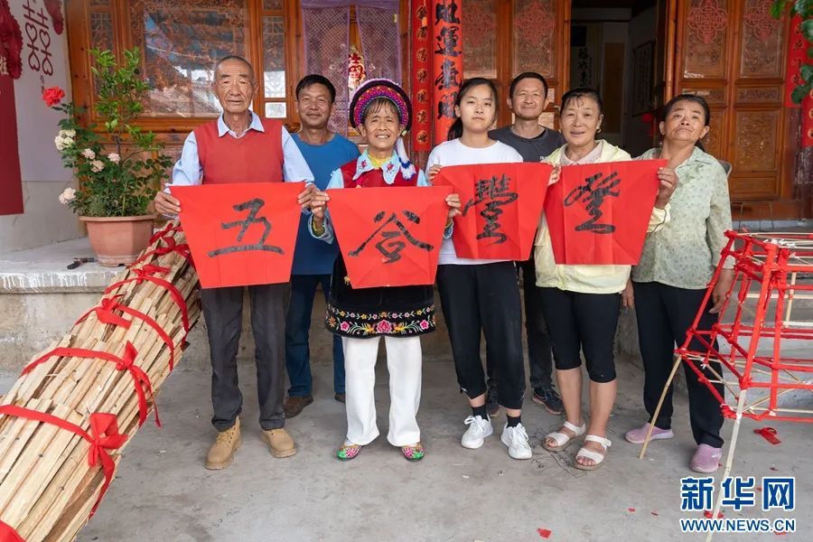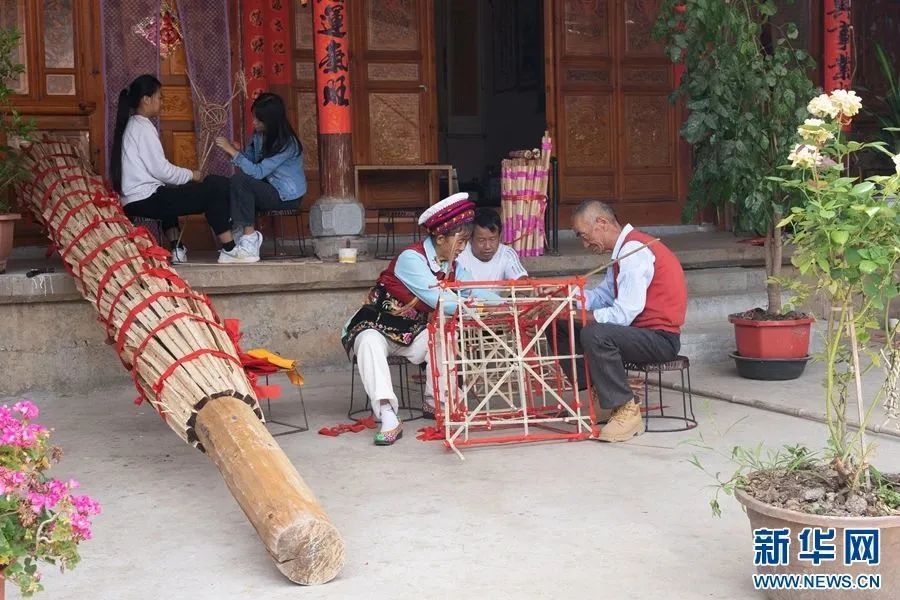 每年农历六月二十五是白族的火把节,村村寨寨都有竖火把的习俗。在杨飞梧扎制的火把中,最有特色的,是由13节组成的大火把。杨飞梧介绍,大火把通常是做12节,一节代表一个月,今年是闰二月,所以要做13节。主体部分完成后,还要再扎4层升斗,最后在火把顶端装饰上纸扎的“白鹤含松”,并在升斗上贴上“五谷丰登”“四季求财”“风调雨顺”等吉祥文字,一根大火把才宣告制作完成。工艺繁复、制作考究的火把,表达了人们对传统节庆的重视、对美好生活的向往。