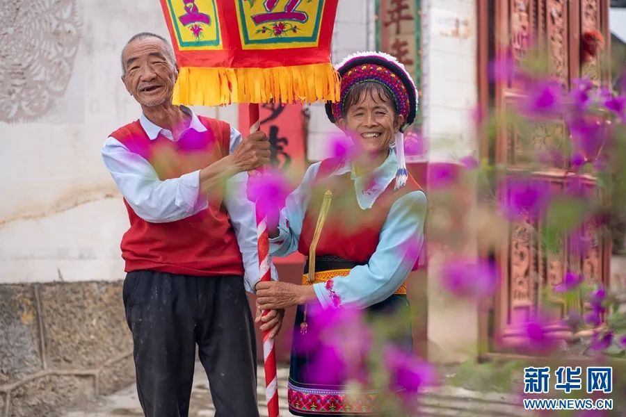 杨飞梧和老伴杨培花一起展示火把的升斗部分(摄于7月28日)。新华网发(罗新才摄)