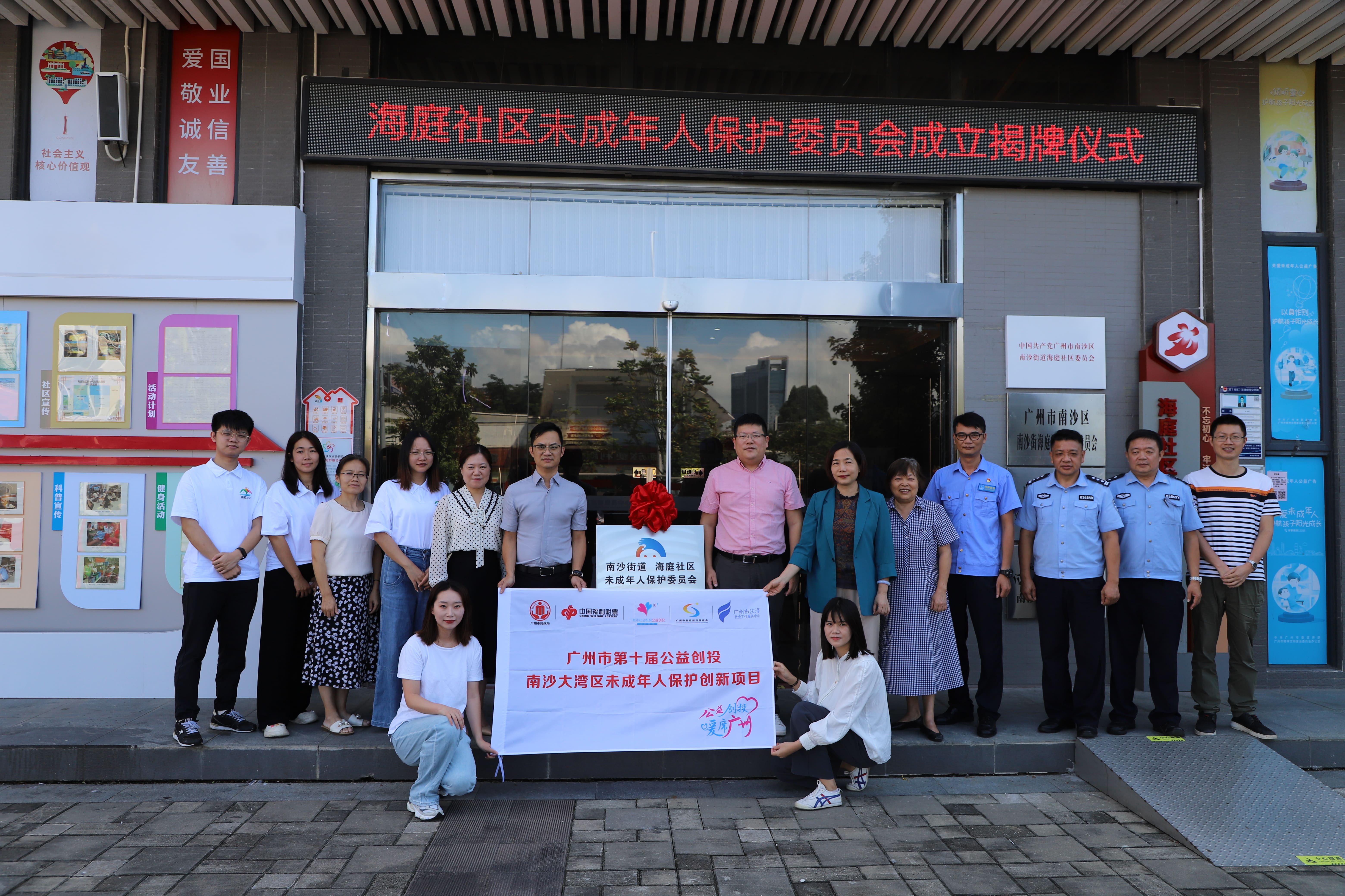 南沙区民政局副局长印锐、广州市法泽社会工作服务中心理事长吴治平、海庭社区党委书记黎宏程与社区基层工作人员、家长、驻居律师代表出席会议,并参加了随后举行的海庭社区未成年人保护委员会成立揭牌仪式。