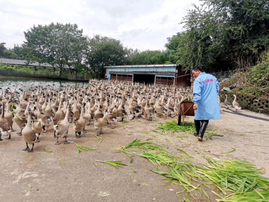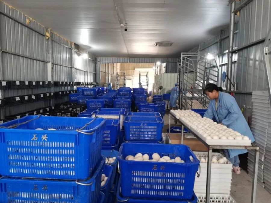 禽苗培育企业里有全自动孵化器,里面整齐摆放着一排排鹅蛋。“全自动孵化机模拟母鹅孵化的自然环境,自动控制温度、湿度和翻蛋次数,提高孵化率。”公司副总经理张伟纯说,目前,公司共有3条生产线,84台孵化机,每台孵化机可孵化鹅苗1.3万羽,每年鹅苗孵化能力可达850万羽。目前孵化场的鹅苗大部分供应给清远、肇庆及江门等地的养殖户。企业实现了“孵化基地+育苗基地+养殖基地”的全链条生产体系,为养殖户提供免疫程序和技术指导等各方面的服务,带动农户发展鹅养殖,让鹅产业稳步发展。