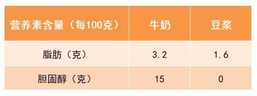 再看胆固醇,豆浆中不含胆固醇,还含有降低胆固醇吸收的豆固醇;而牛奶中含有少量胆固醇。