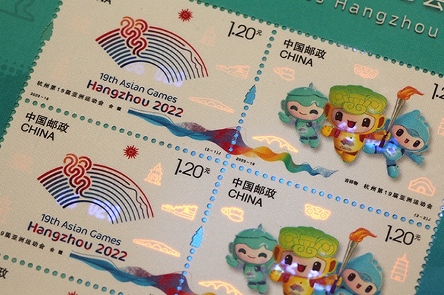 中国邮政定于明天(9月23日)发行《杭州第19届亚洲运动会》纪念邮票一套2枚,邮票图案名称为会徽、吉祥物。全套邮票面值2.40元。邮票计划发行数量为783万套,版式二88.5万版。