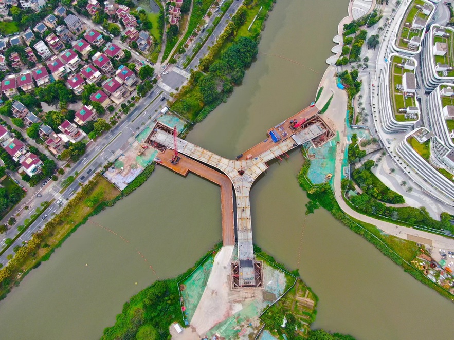 创享湾人行桥及周边功能完善工程,位于南沙区蕉门河中心区中轴腹地的中央商务区,由中国工程院院士何镜堂领衔设计,广州市南沙区建设中心建设,中铁广州工程局施工,是南沙区2023年重点工程建设项目之一。项目主要包栝5座人行桥及4处桥体周边景观建设,涉及桥梁、景观、照明、道路工程等施工。工程具有安全风险大、工期压力大、施工组织难度大、社会影响力大等特点,施工质量要求极高。