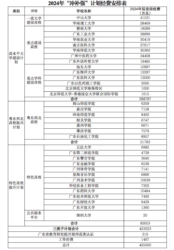 为切实解决广东省高等教育发展不平衡不充分问题,增强高校服务创新驱动发展战略的能力,加快高等教育内涵式发展,结合各高校建设情况,广东省教育厅研究制定了2024年高等教育“冲一流、补短板、强特色”提升计划工作资金安排方案(见下图)。
