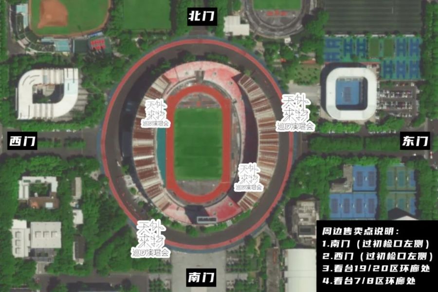 此外,现场将设置4个周边售卖点分别在 看台19/20区环廊处、看台7/8区环廊处、南门(过初检口左侧)、西门(过初检口左侧)。周边售卖的时间为17:00-19:00;官方周边商品,只在体育场内现场贩售,体育场外并无设置任何官方销售点,请歌迷朋友们特别留意。