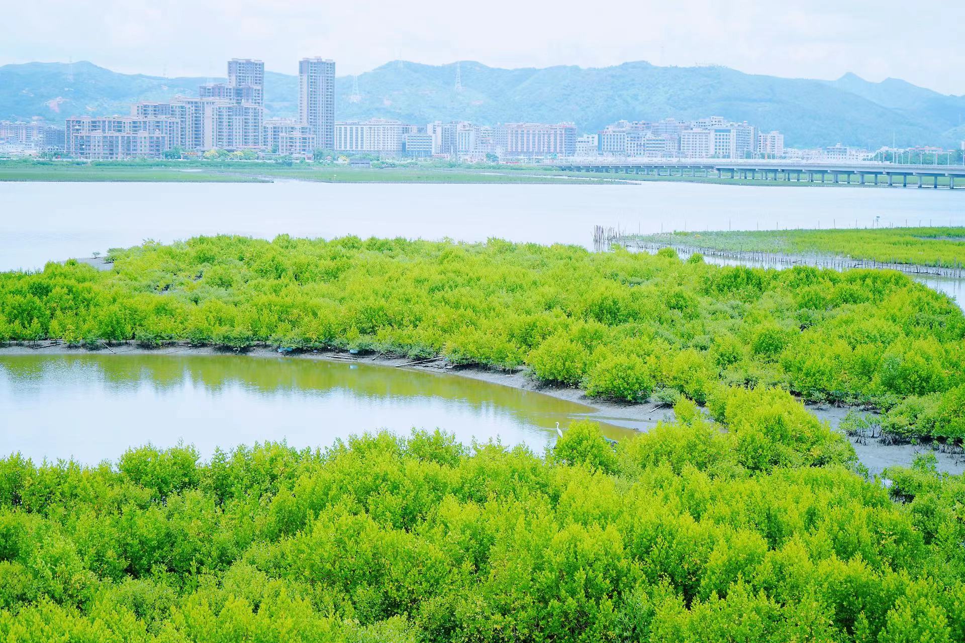 而在位于考洲洋上盐洲岛的惠东湿地公园内,登临观景台,眼下的红树林已经非常茂盛,成群的鸥鹭飞舞,远处波光粼粼,时有船只往来,一派欣欣向荣景致。