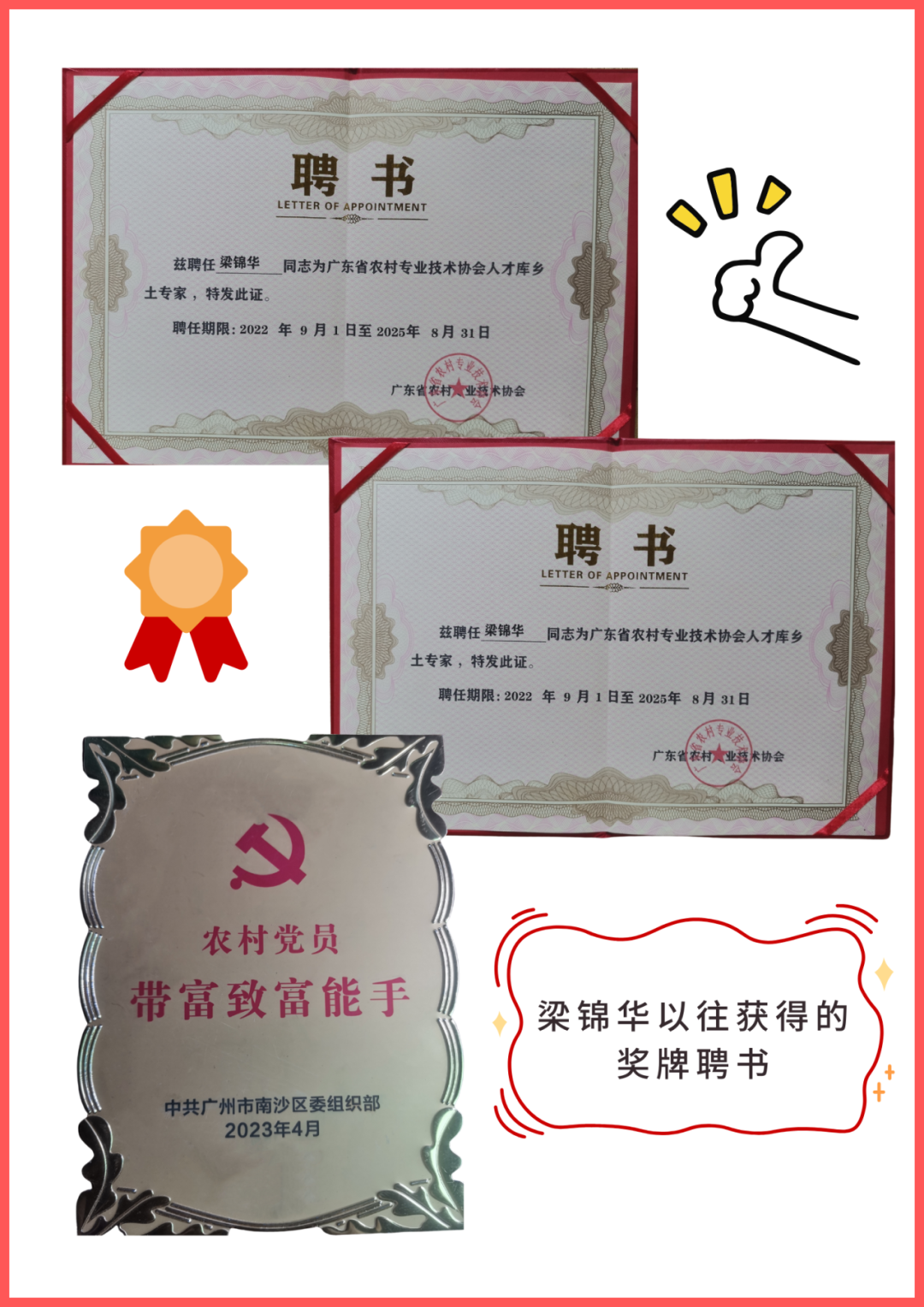 2023年4月,他获得中共广州市南沙区委组织部授予的“农村党员”带富致富能手称号。