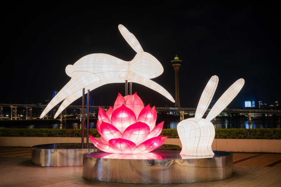 花灯节一共呈现八件身高3米至4.7米、由著名设计师陈幼坚所设计的奇幻玉兔灯笼装置,其中五件玉兔装置错落有致地分布在海滨长廊中,另外三件则在壹号广塲以及澳门美高梅酒店内优雅伫立。