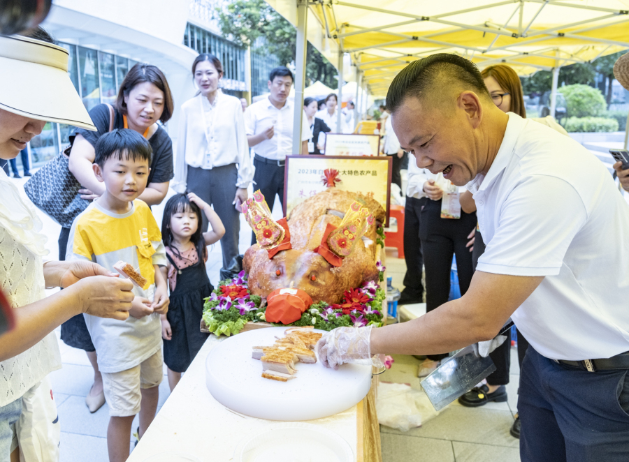 致敬农民,礼赞丰收!9月23日,2023年广州市白云区农民丰收节暨农耕文化节在位于钟落潭镇的广州种业之都举行。在白云优品展销区,洲星马蹄、百兴穗香鸡、沙田柠檬、燊之源罗汉松等众多本土优质农产品及裕成乳猪、朱仔烧腊等白云区非物质文化遗产集体亮相,吸引了不少市民现场开心试吃,爽手抢购。