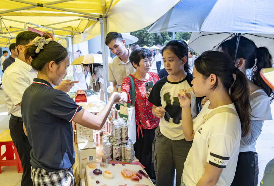 记者在丰收节现场的白云名优农产品展销摊位看到,洲星马蹄、百兴穗香鸡、沙田柠檬、燊之源罗汉松、南岗富民瓜果、祥记杨桃等众多本土优质农产品及裕成乳猪、朱仔烧腊等白云区非物质文化遗产悉数亮相,多个农业企业、农民专业合作社的工作人员热情招呼市民群众试吃品尝。名优特产的“掌门人”纷纷亲自下场,卖力宣传推广。