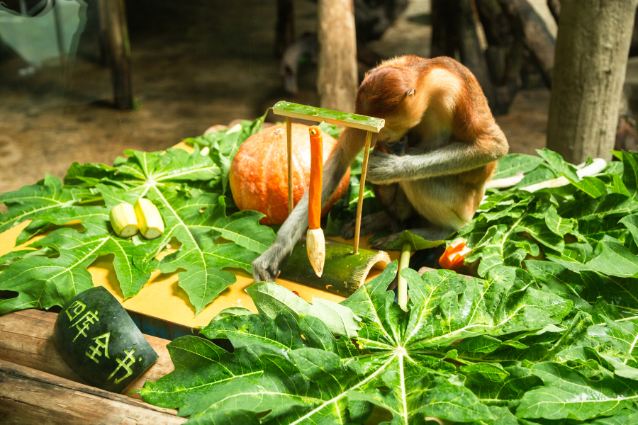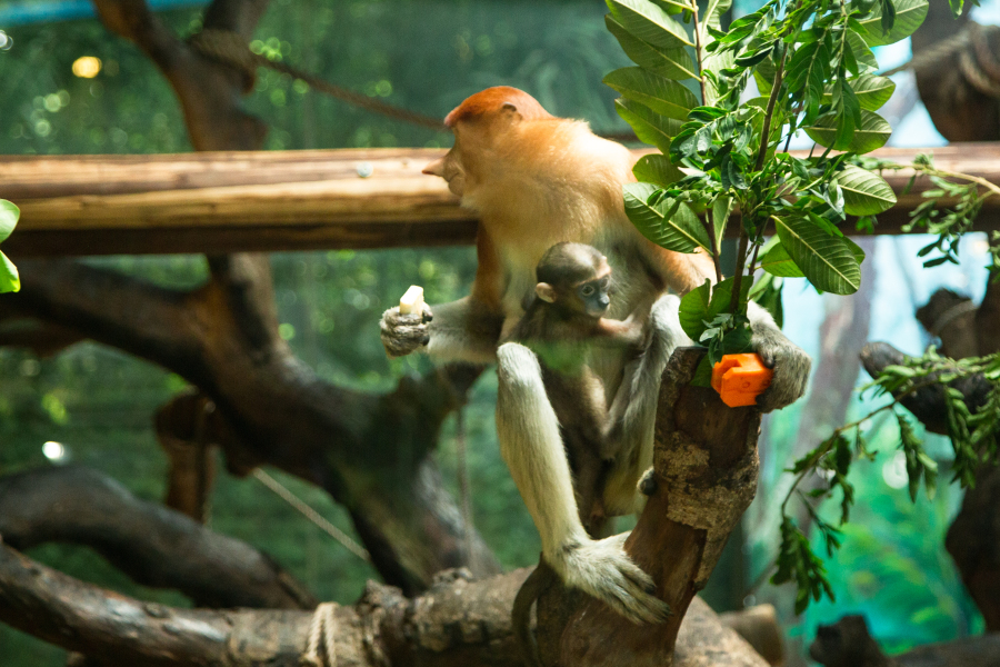 启动日当天,新生猴宝首次公开亮相,6月14日出生的新生长鼻猴幼崽是Dewa家族Jasin的第四个女儿,被命名为“森怡”,她在长鼻猴妈妈的协助下进行“抓周”仪式,吸引了不少游客围观。