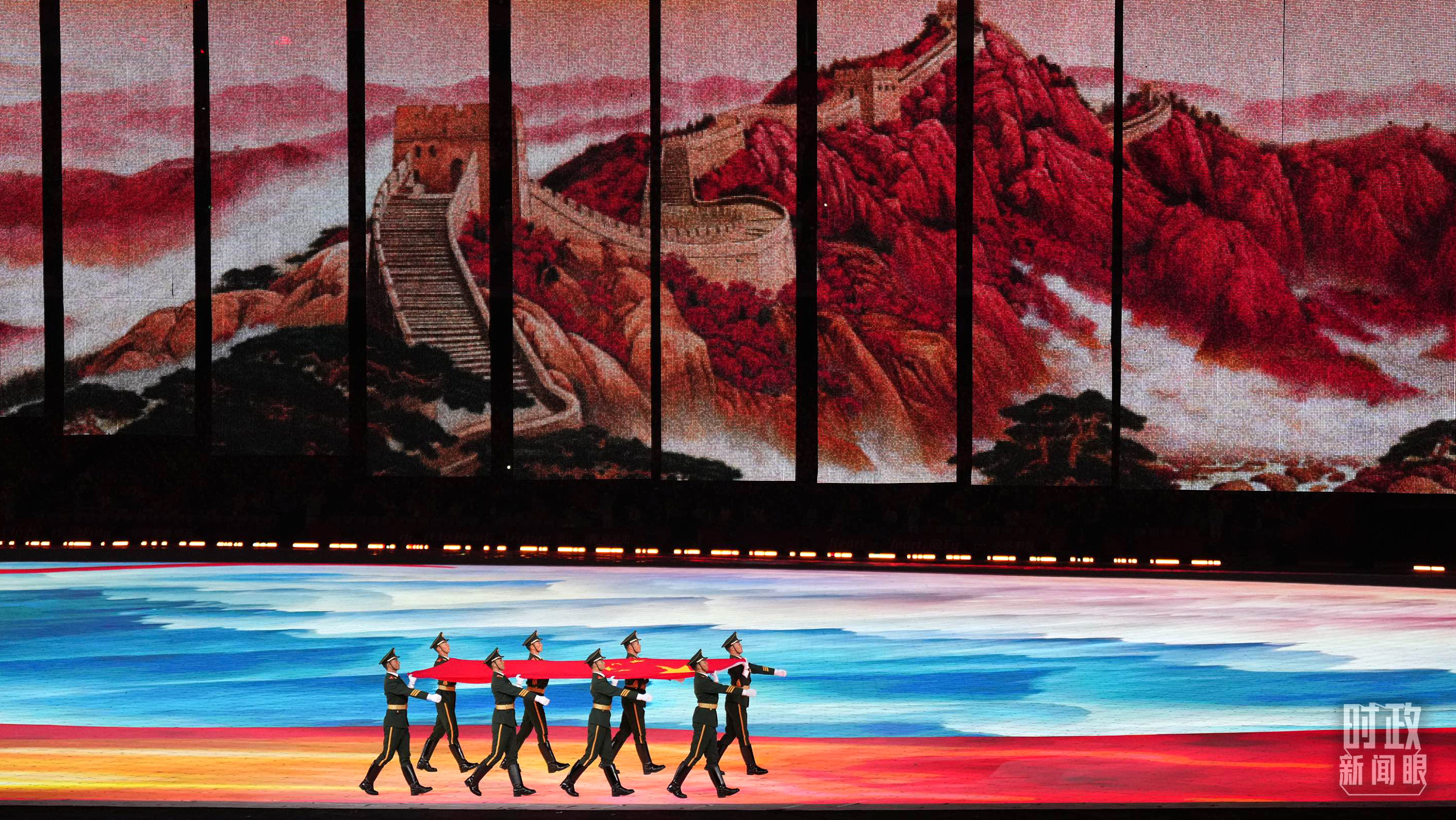 △踏着红绸铺就的道路,五星红旗入场。(总台央视记者魏帮军、国广记者李晋拍摄)