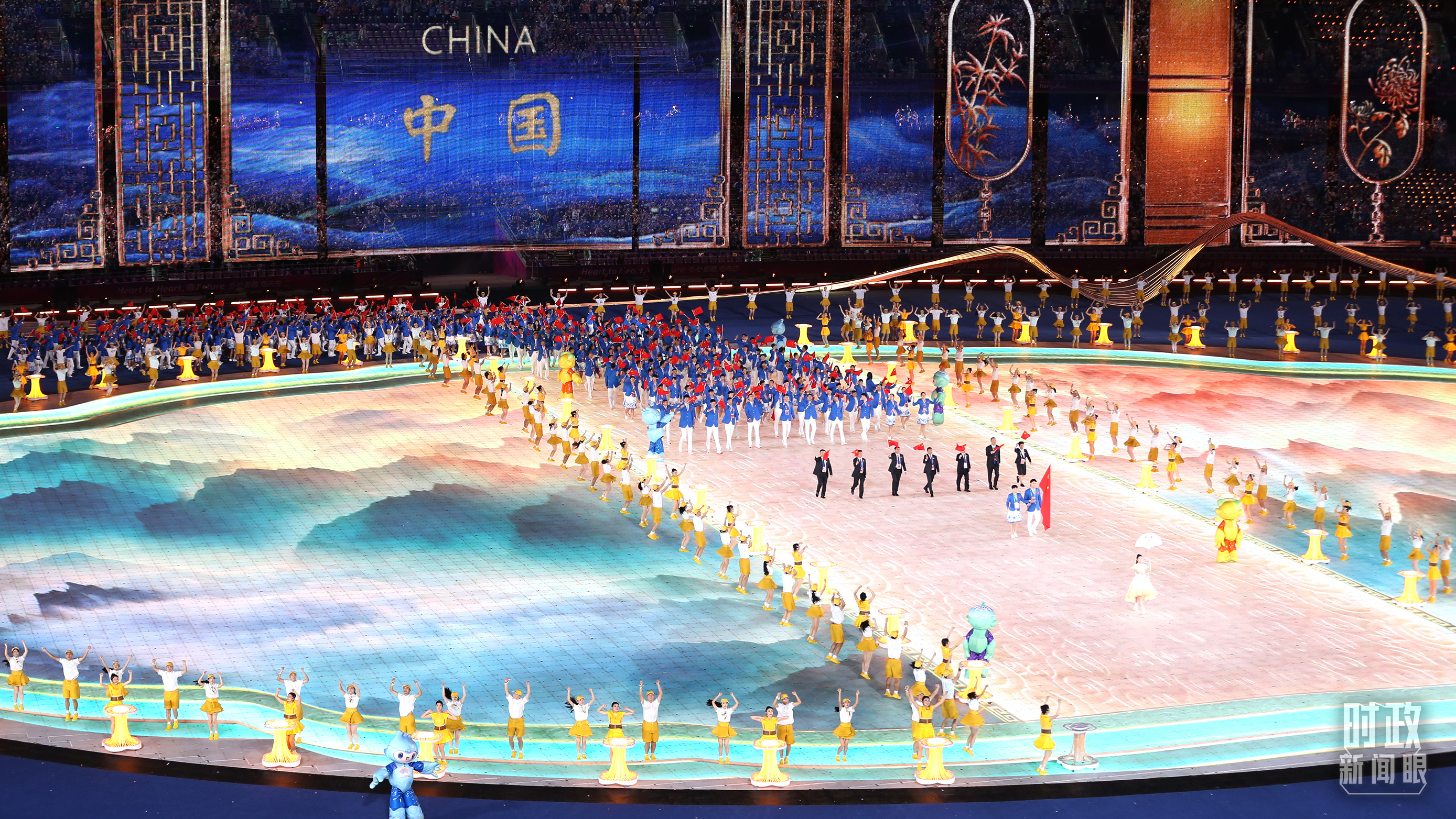 △开幕式文艺表演中的亚运会吉祥物。(总台央视记者魏帮军拍摄)