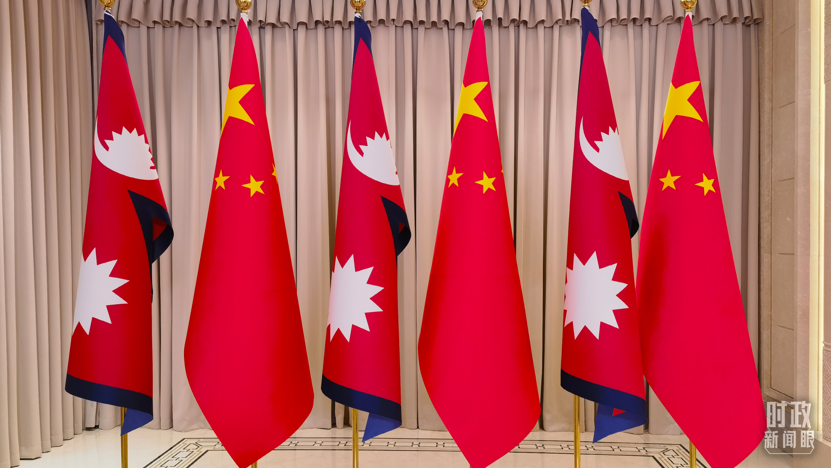 △会见现场摆放的中国、尼泊尔国旗。(总台央视记者周志国拍摄)