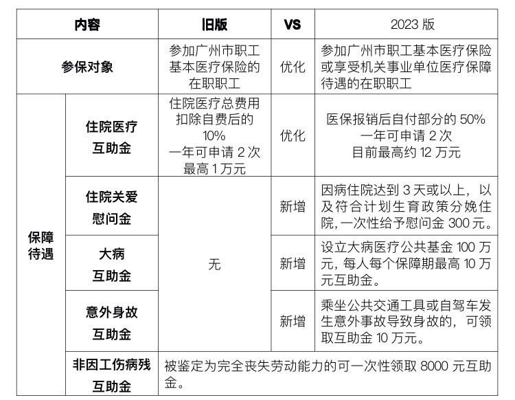 旧版广州市职工住院医疗互助保障计划参保对象仅限于参加广州市职工医保的职工,2023版推出后,享受机关事业单位医疗保障待遇人员也能参保,实现保障对象全覆盖。