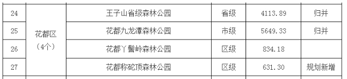 根据《规划》,到2035年,广州全市规划森林公园54个,面积共计77906.85公顷。其中,规划新增7个,面积共计5481.70公顷,分别为白云六片山森林公园、黄埔油麻山森林公园、南沙大山乸森林公园、南沙南大山森林公园、花都称砣顶森林公园、从化通天蜡烛森林公园、增城南坑顶森林公园。