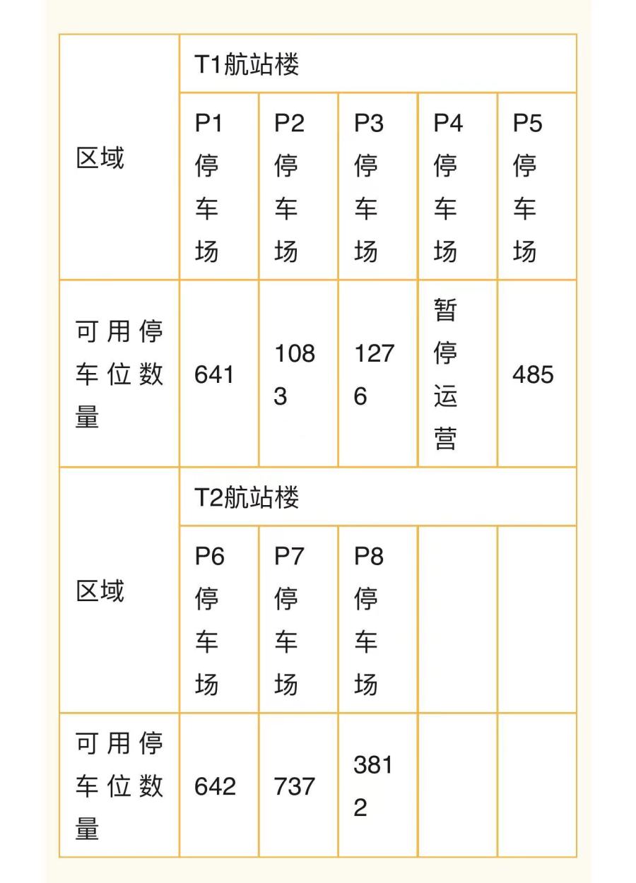 目前,白云机场除P4交通综合体工程项目建设需要,仍在封闭施工外,其余7个旅客停车场均对外开放,提供停车位8676个。其中,T1航站楼现开放的有P1、P2、P3、P5共4个停车场,共有3485个停车位;T2航站楼有P6、P7、P8共3个停车场,共有5191个停车位。所有停车场均支持微信、支付宝、银联、ETC(粤通卡)无感支付。