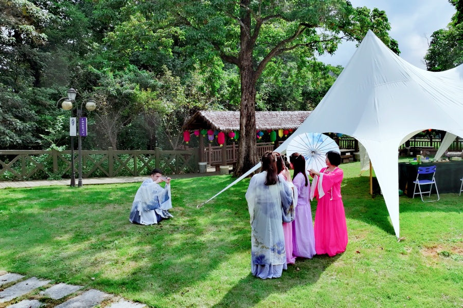 活动当天,景区在森林营地上搭建了天幕、帐篷等供游客小憩,举办了露营party、品茶、汉服体验、放风筝等活动吸引了众多市民游客前来参与,场面十分热闹。人们相聚在流溪湖景区驿站草坪,亲身感受中国汉服文化的魅力。现场沉浸式感受国风的别样魅力,受到很多游客和市民欢迎。