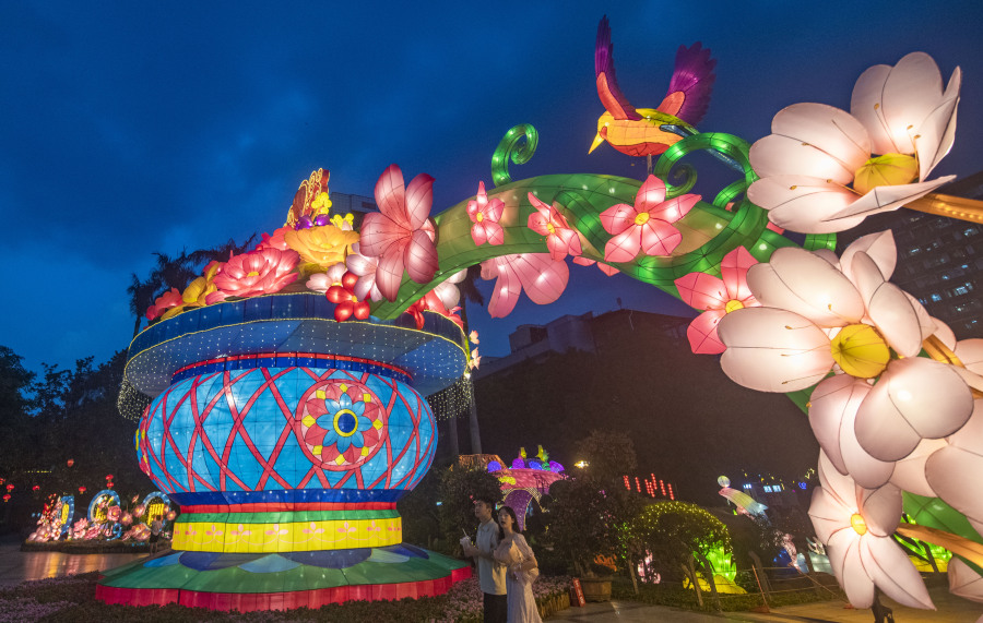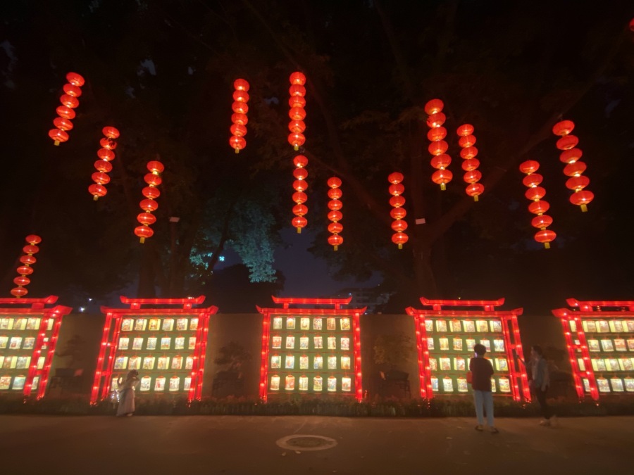今年灯会最大的一组是位于中心广场的灯组,名为《繁花似锦绽华章》,跨度达75米,高10米,无论是体量、高度、跨度都是历年之最。灯组中间大花篮的造型繁花似锦、气势恢宏。两侧是古代文人关于十二花神的经典诗句,姿态各异的花朵以及优美的诗句,引得观赏者驻足品味。