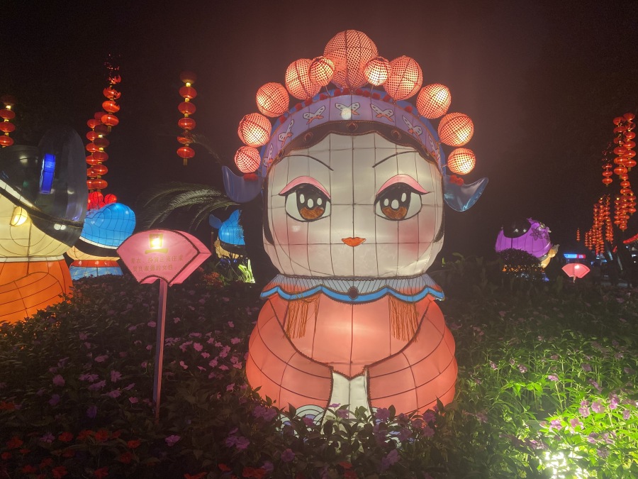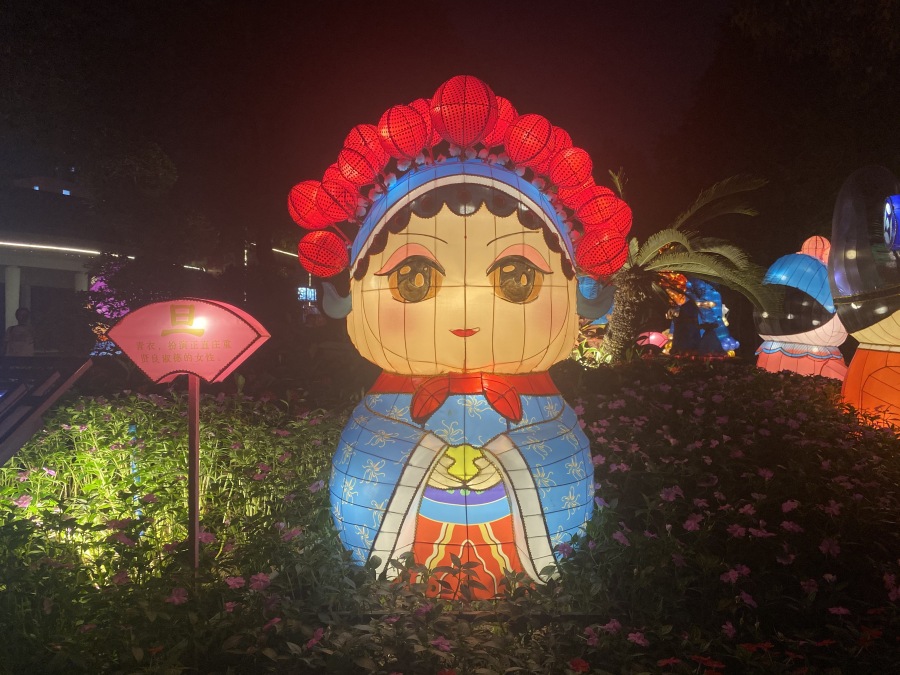 本次灯会还突出表现了西关文化和岭南文化。灯组《国潮粤色》以粤剧角色为主角,卡通造型让原来严肃单调的旦、净、丑等角色,看起来憨态可掬,受到年轻人喜爱,同时配上经典粤曲的音乐,寓意“南国红豆”粤韵悠扬,声声不息。《国粹耀羊城》中的中国象棋,彰显广州文化公园深厚的棋文化底蕴。《西关记忆》表现的是“舌尖上的童年”鸡公榄,只见可爱的兔宝把五彩大公鸡套在身上,一步一摇中,勾起老广们的童年回忆。