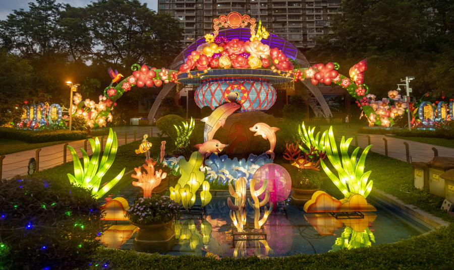 灯组《自然生态新篇章》表现人与自然和谐共生之美,其中“森林精灵”长颈鹿扭动着脑袋,俏皮的狐狸摇着大尾巴,憨厚的浣熊晃动着头部,他们都亲切地跟游客打招呼。而扑翅欲飞的蝴蝶更是吸引了不少孩童的目光。还有灯组《双鱼戏莲》造型小巧精致,鱼儿跃出水面吐出一串串的泡泡,灯组《璀璨明珠》坐落在中心水池,五彩斑斓的珊瑚,美丽飘逸的水母,配以水雾装置和流水音效让灯组独具一份梦幻之美。