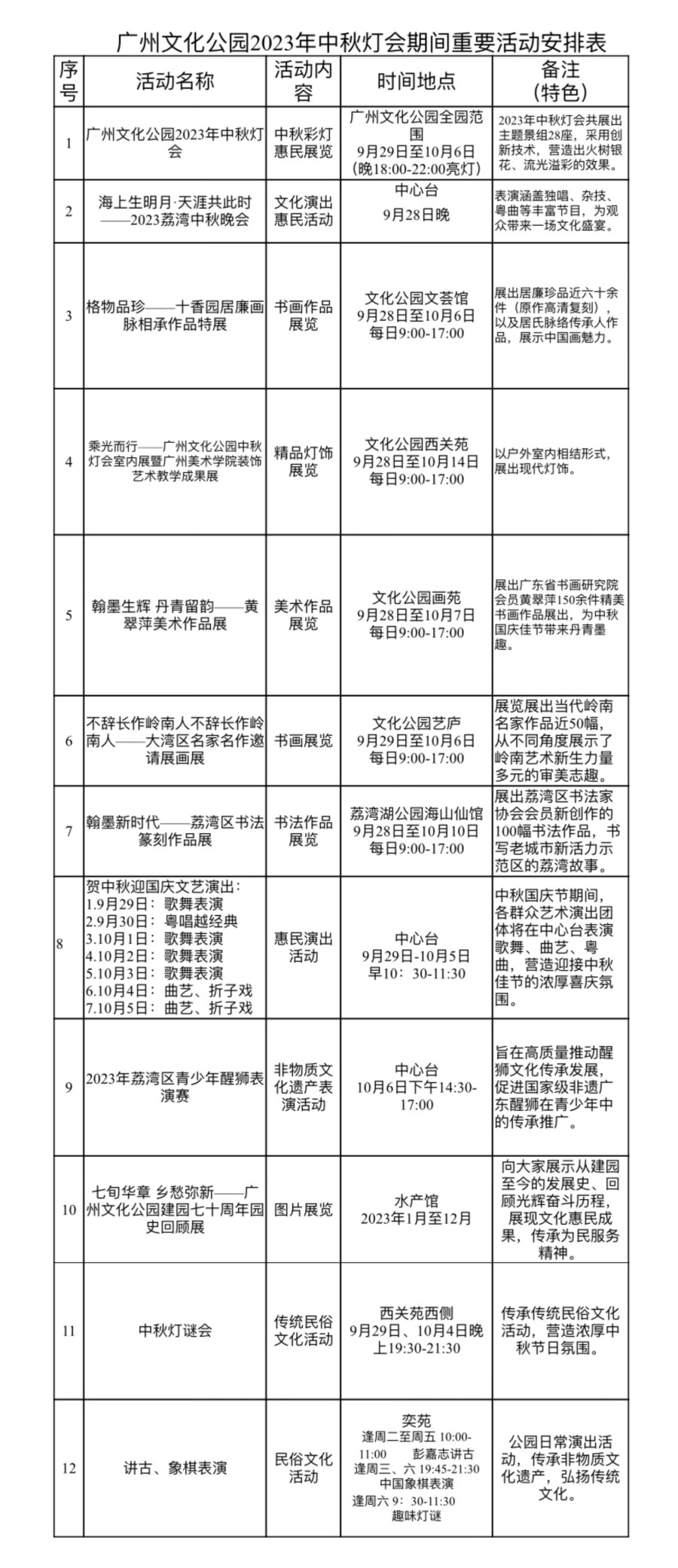 中秋国庆期间,广州文化公园每天安排有丰富多彩的文化活动,包括歌舞表演、象棋表演、灯谜讲古等传统民俗活动,以及书画展览、摄影展览等群众文化惠民活动,为广大市民游客营造欢乐、祥和的节日气氛。