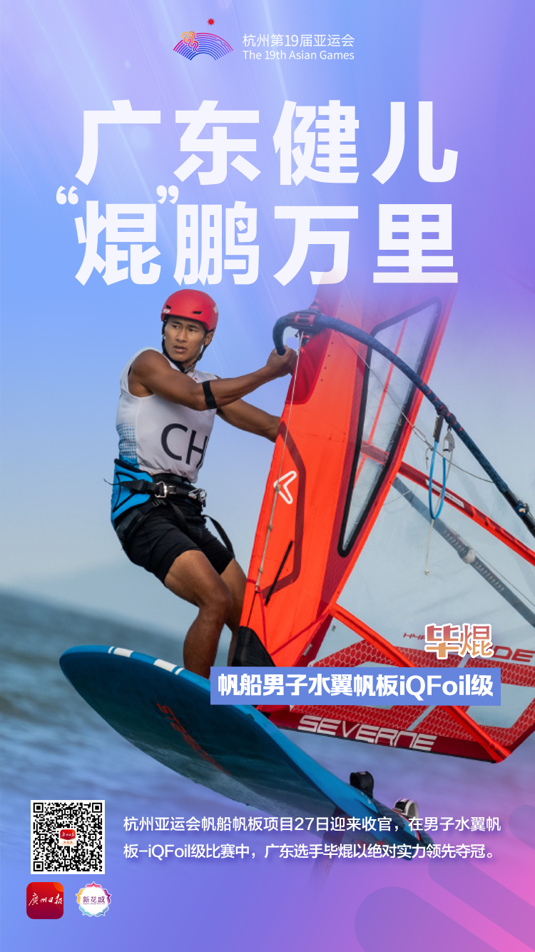 9月27日,在杭州亚运会帆船项目男子IQFoil级水翼帆板决赛中,广东运动员毕焜发挥出色,为中国体育代表团夺得金牌。