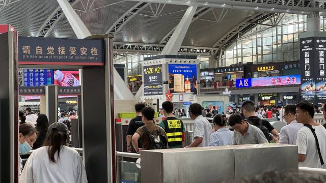 在广州南站的进站口,一条长龙般的队伍缓慢而有序地向前移动。每个旅客都带着行李,脸上流露着出游的喜悦。他们穿过安检门,然后步向检票口。