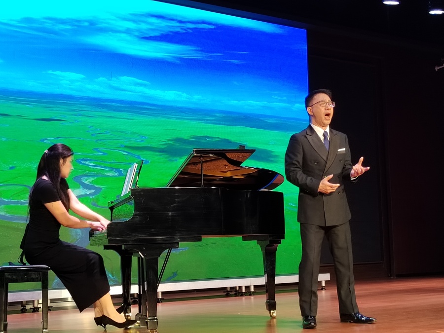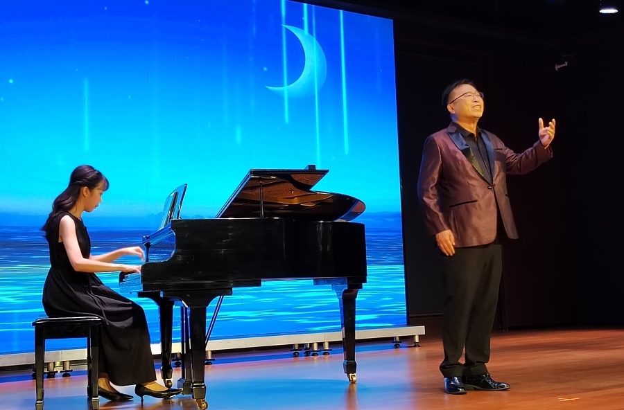 “天上一个月亮,水里一个月亮。”音乐会以一首《月之故乡》拉开序幕,这首歌旋律优美柔和,具有浓郁的民族风格。皓月当空,倒映在湖面。“看月亮,思故乡,一个在水里,一个在天上。”旅法青年男中音、华南师范大学音乐学院声乐讲师陈晓东的演唱,引发观众思绪万千。
