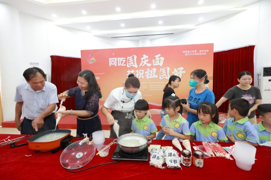长者和学生代表纷纷现场体验“挤鱼青”下锅制作等环节。在欢声笑语中,一锅又一锅热气腾腾的渔面新鲜出炉。大家其乐融融同吃渔面,共祝祖国好。