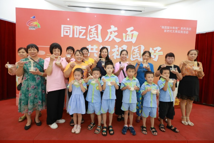 9月28日上午,“同吃国庆面 共祝祖国好”——2023年佛山市顺德区新时代文明实践活动在大良街道古鉴村新时代文明实践站举行。活动中,长者和学生代表齐聚一堂,同做、同吃“国庆面”,共同庆祝中华人民共和国成立74周年。