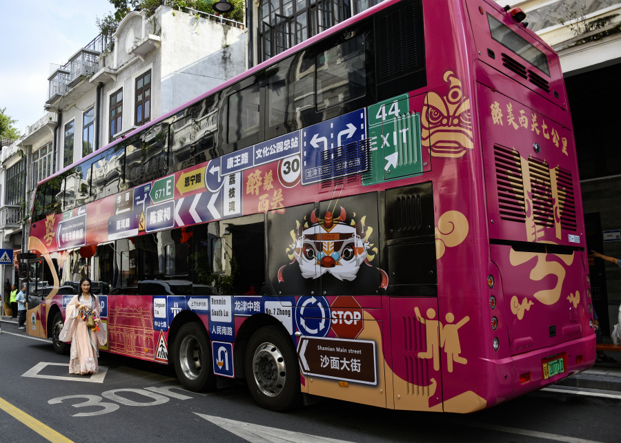 “醉”美西关文旅主题车以“文化+艺术+旅游”为定位,成为广州首个移动文化空间终端载体。在“醉”西关主题双层巴上,沿途“西关7公里4A景区+非遗文创街区”的特色文化标识,通过鲜艳色彩和趣味造型逐一展示在车身,十分引人注目。