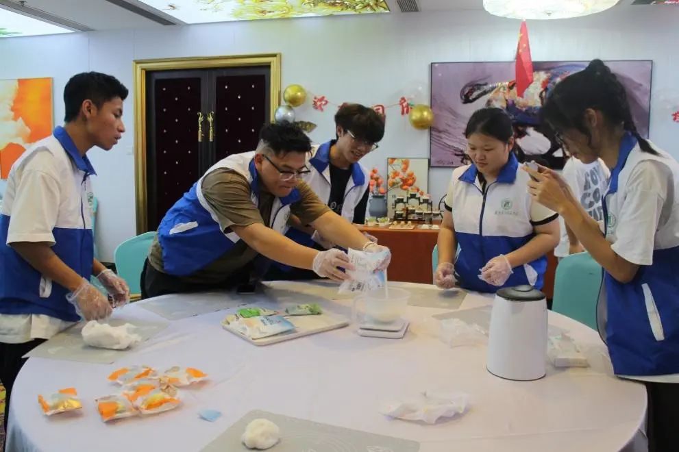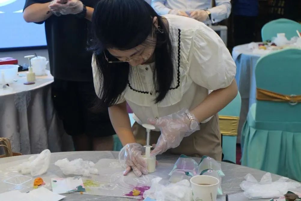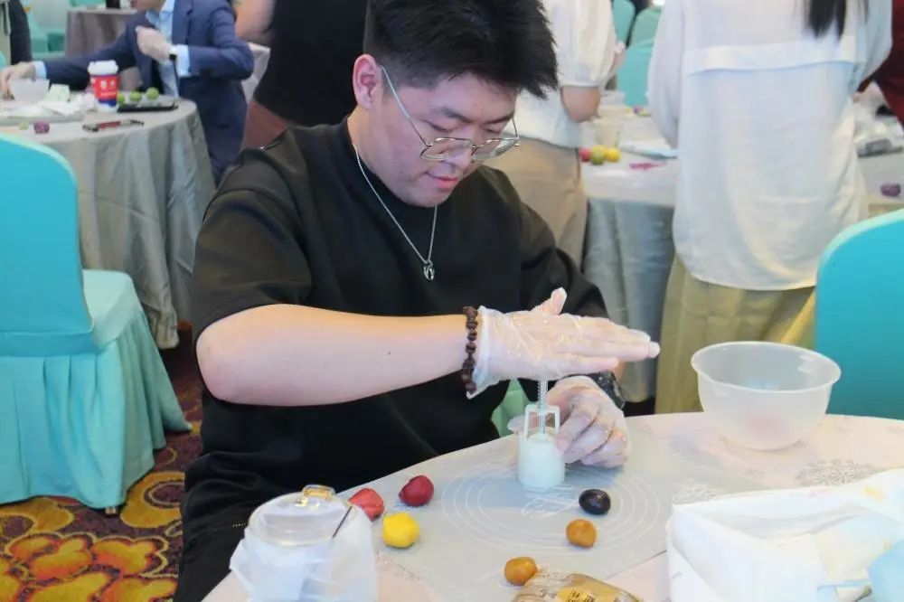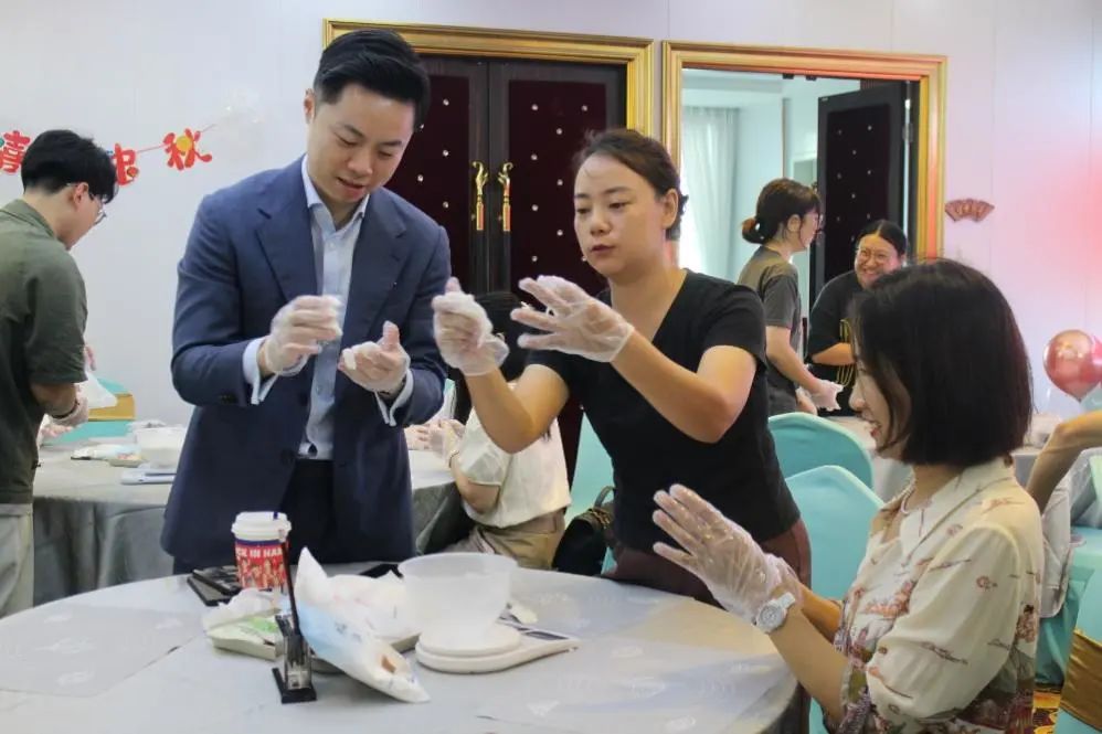 活动现场,工作人员为大家准备好做冰皮月饼需要的预拌粉、馅料、模具等物品,并邀请了专业面点师现场讲解冰皮月饼的制作技巧和方法。在老师的讲解演示下,大家迫不及待开始动手制作,揉皮、称重、包馅、放入模具按压成型,现场气氛温馨热闹。