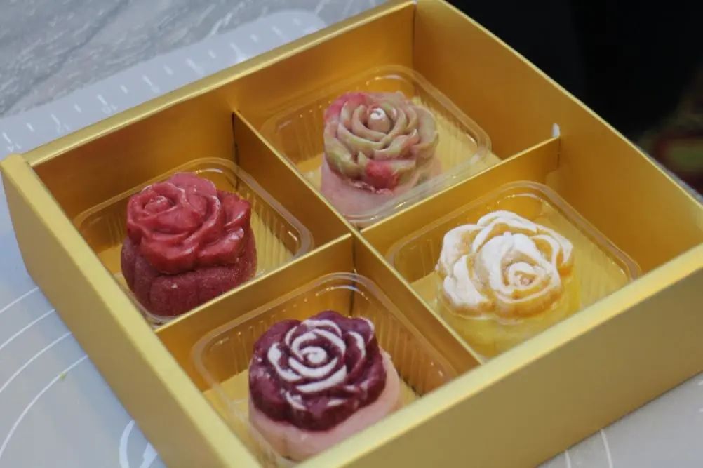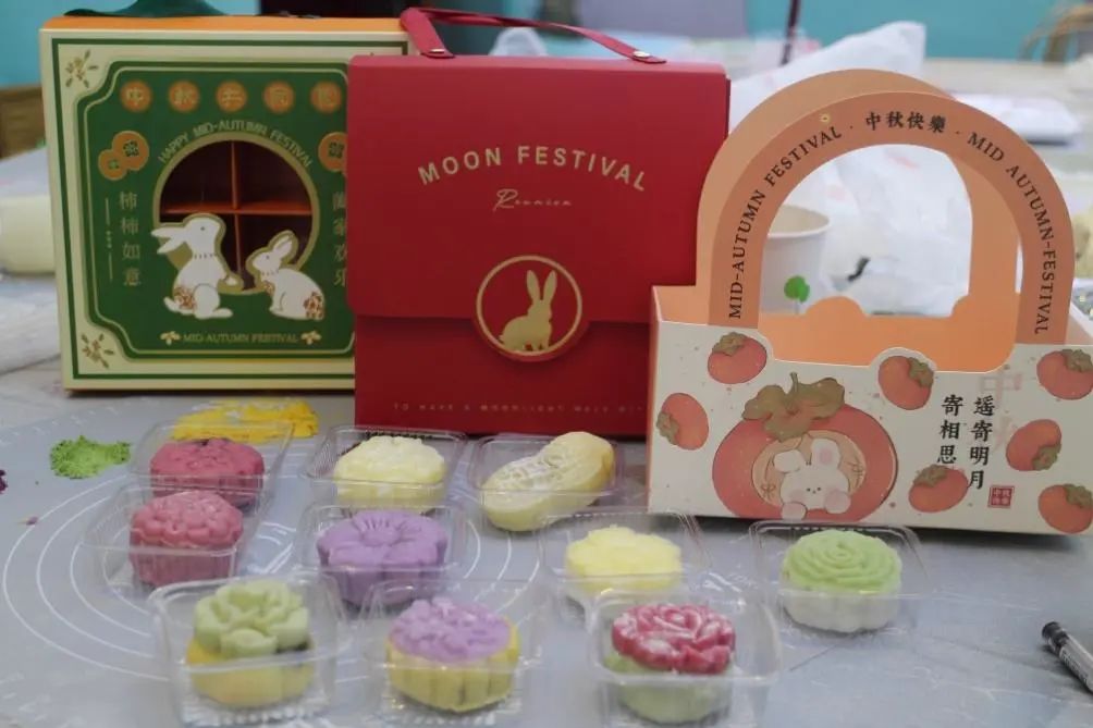 经过一个多小时的制作,玫瑰花、梅花、花生……一盒盒各式各样的冰皮月饼就制作完成了,精美的图案吸引大家互相围观。看着自己制作的月饼,大家脸上都洋溢出了幸福的笑容,提前感受到了中秋节的快乐,活动现场其乐融融。