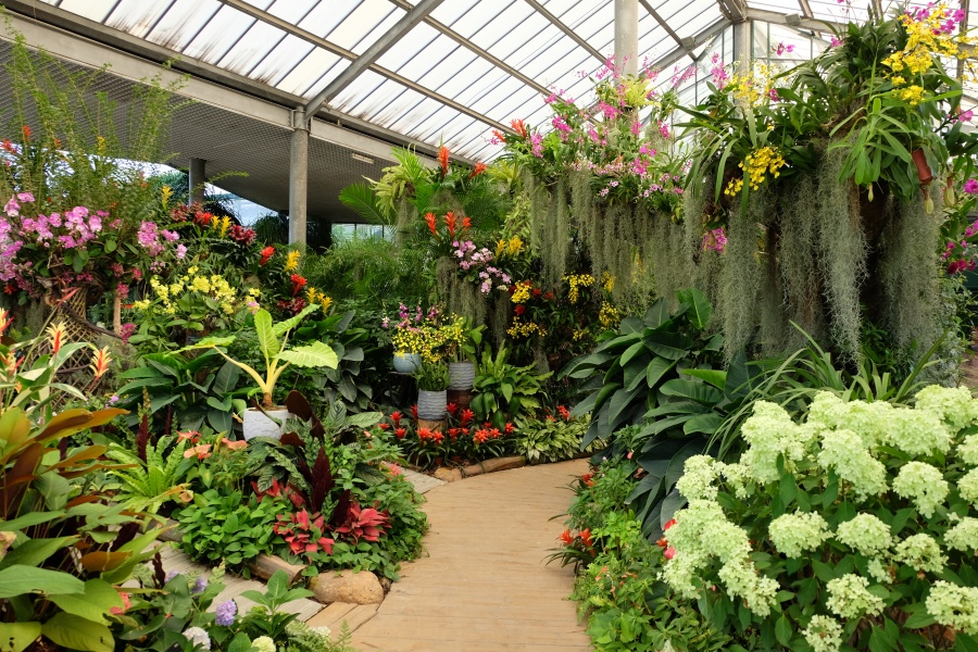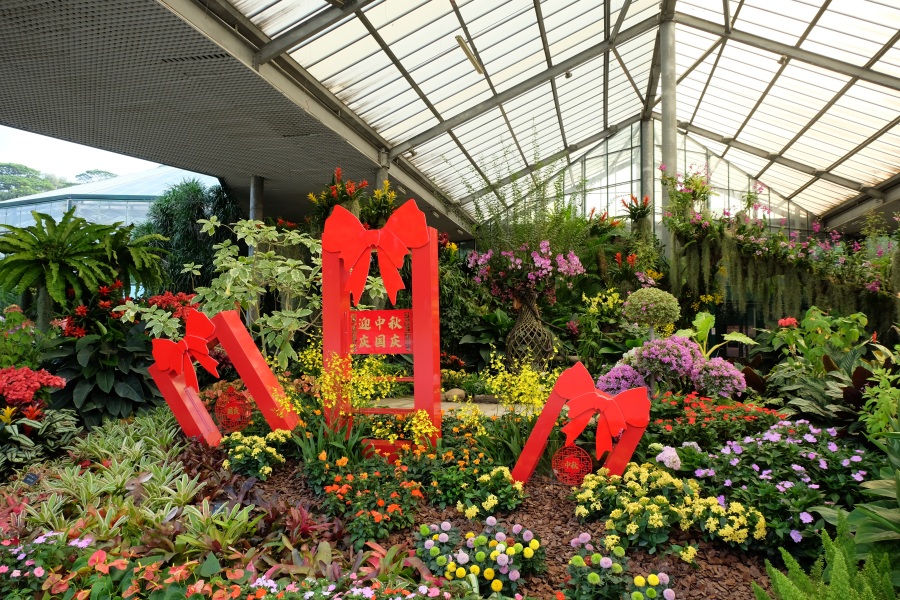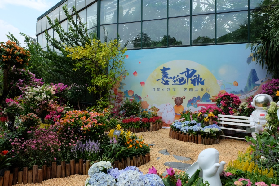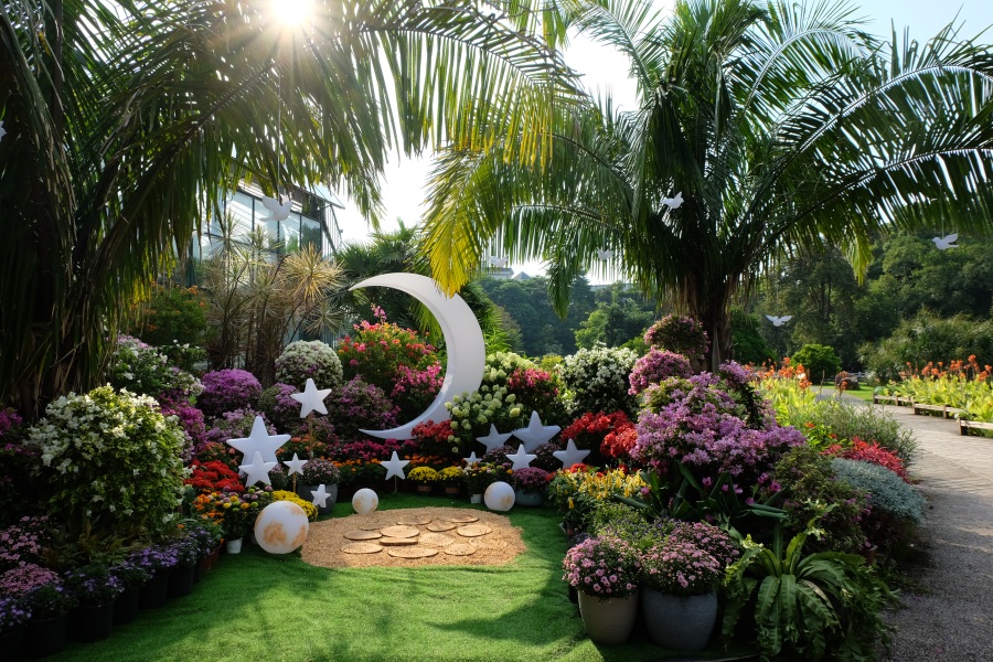 本次“‘叶’比花娇主题植物展”的展览地点在温室群景区,打造出“鸿运当头”“玉兔梦花园”“镜花映月”三个主场景,月亮、玉兔、球灯、海鸥、圆形永生花墙等造型,营造中秋国庆双节相逢的喜气满盈之景。植物布置上突出“似花不是花、叶比花更娇”主题,布展造型簕杜鹃29个品种,以及红星凤梨、星花凤梨,地涌金莲、红掌、美苞舞姜花、姜荷花、翠鸟蝎尾蕉、粉纸扇、红纸扇、白纸扇、黄虾花等观苞片类植物,营造出色彩浓烈、喜庆热闹的节日氛围,同时向公众普及此类植物的观赏特性。