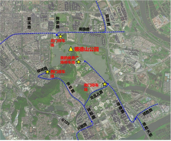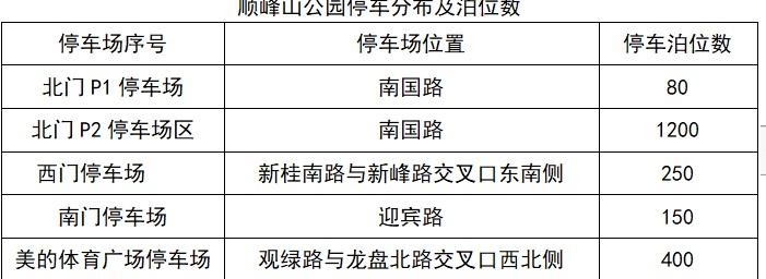 (1)顺德山公园共开放北门停车场、西门停车场、南门停车场、美的体育广场停车场,共约2000个停车位。