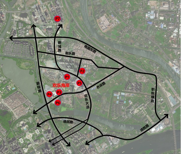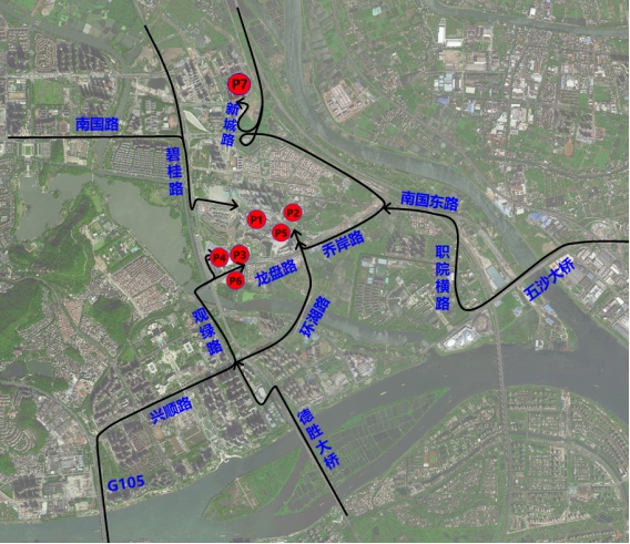 广珠西线来车:新城路-P7停车场,南国路-乔岸路-P2、P5停车场;